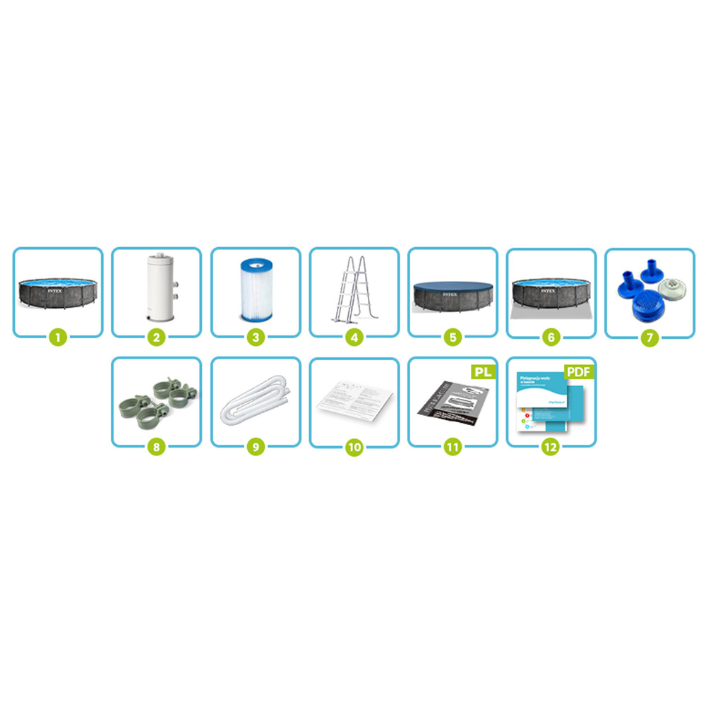 - Basen ogrodowy stelażowy Intex Greywood Prism Frame Premium Pools! o wymiarach 457 x 122 cm. Zestaw 12 w 1: Basen | Pompa | Filtr | Sitka i zaciski | Węże | Przewodnik po chemii | Instrukcja | Mata| Pokrywa| Łatka