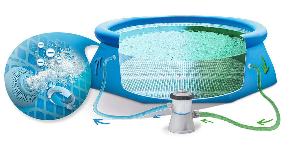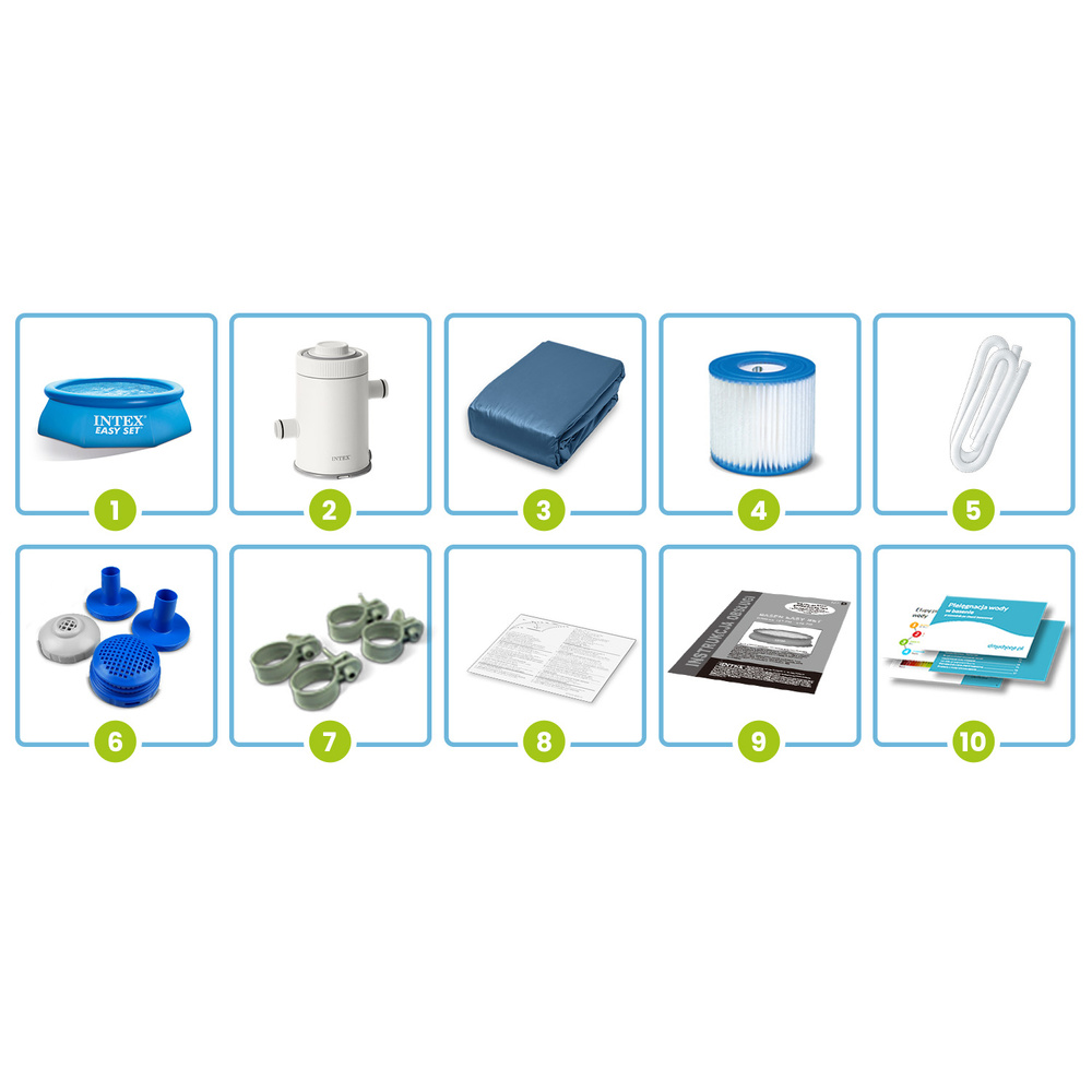 Do kompletu dołączona jest pompa kartuszowa o wydajności 1250 l/h wraz z filtrem typu H, która zapewnia odpowiednią filtrację wody oraz usuwa zanieczyszczenia. W zestawie znajdują się niezbędne akcesoria takie jak wąż, zaciski oraz sitka zatrzymujące większe zanieczyszczenia. Do pompy dołączona jest również instrukcja zawierająca informacje o sposobie korzystania oraz spis elementów składowych.