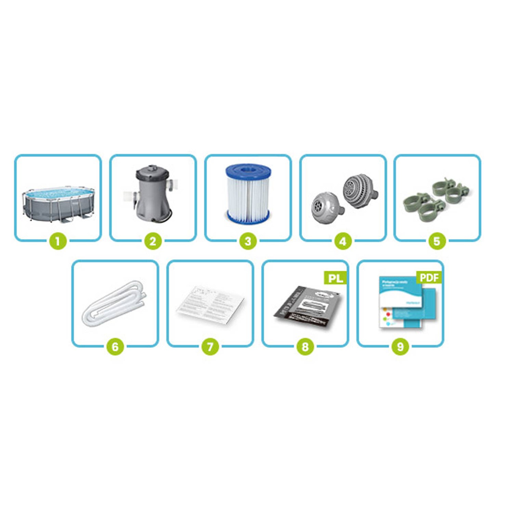 - W zestawie akcesoria: pompa filtrująca, filtr do pompy, dozownik chemii, łatka naprawcza.