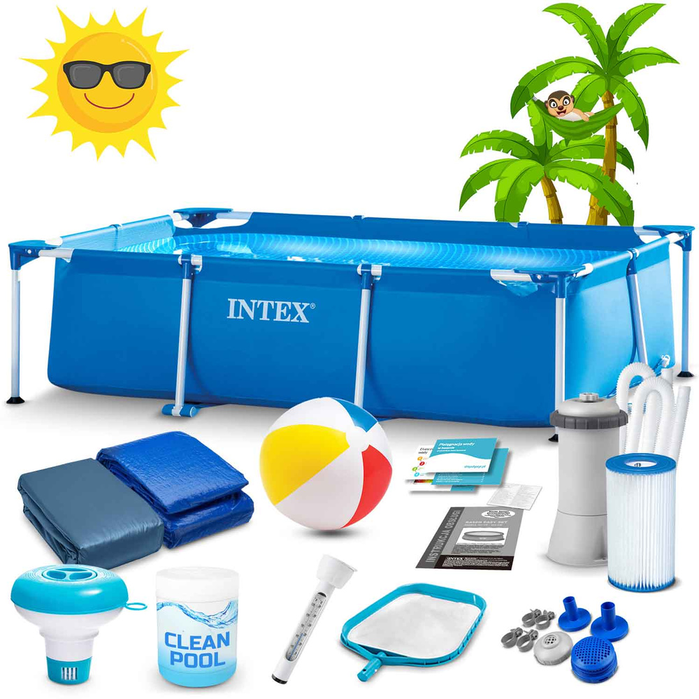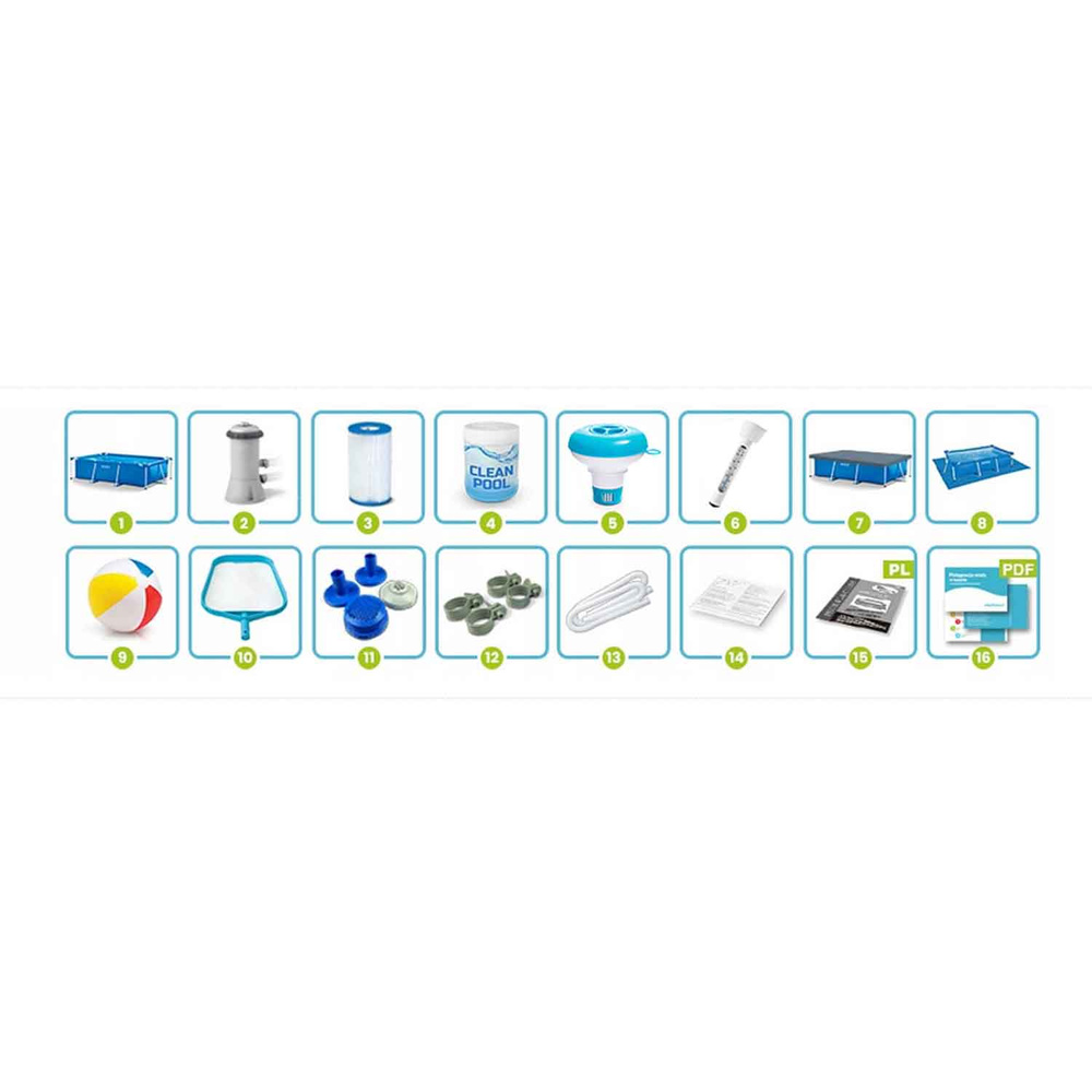 - Basen ogrodowy stelażowy Intex o wymiarach 300 x 200 x 75 cm w zestawie 15w1 zawiera m.in. pompę filtrującą, filtr typu A, chemię basenową, dozownik, termometr, pokrywę, matę pod basen, piłkę plażową oraz akcesoria do pielęgnacji.