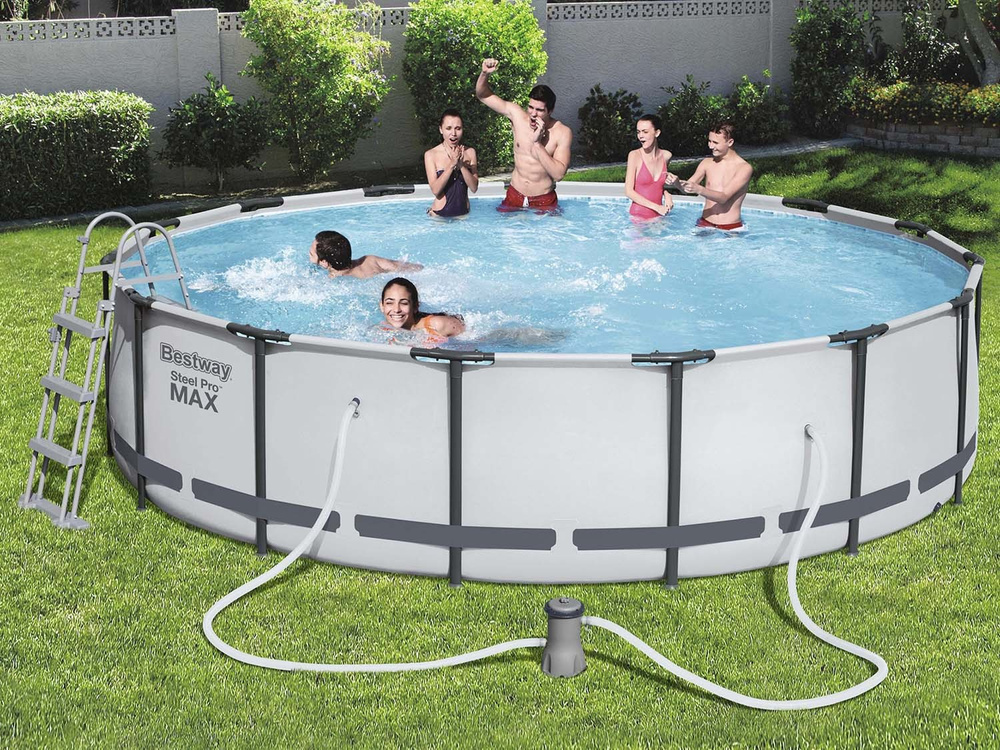 - Basen ogrodowy stelażowy Bestway Power Steel 427 x 107 cm. Zestaw 19w1: pompa filtrująca, filtr typ II, dozownik ChemConnect™, drabinka, pokrywa, mata pod basen, chemia basenowa, termometr, pływający dozownik, siatka do czyszczenia, zestaw naprawczy.