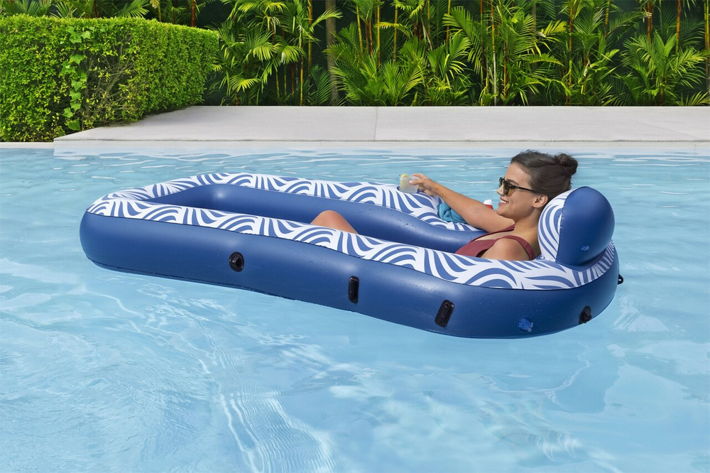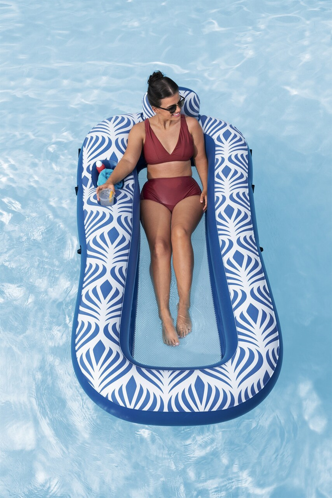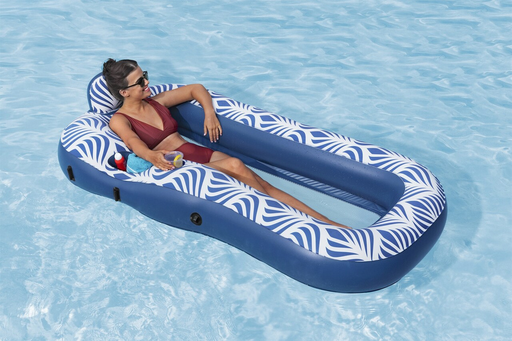 - Materac do pływania Bestway o wymiarach 198 x 112 cm, wyposażony w odpinany daszek, wbudowaną poduszkę, uchwyt na napój oraz siateczkowe dno dla komfortu i chłodzenia. Wykonany z wytrzymałego PVC, z maksymalnym obciążeniem do 100 kg.