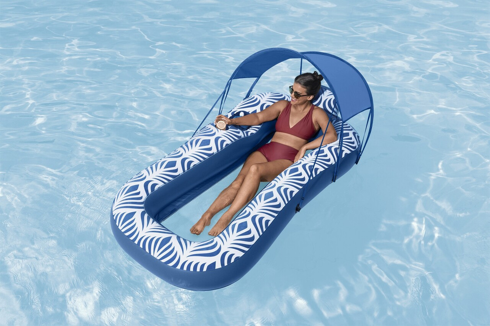 - Odpinany daszek: Chroni przed nadmiernym nasłonecznieniem, zapewniając przyjemny cień podczas pływania. Możliwość łatwego demontażu pozwala dostosować materac do aktualnych potrzeb.
