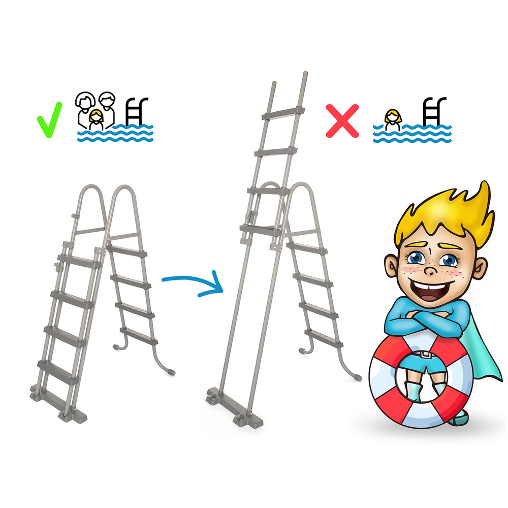 - **Bezpieczeństwo:** Drabinka z antypoślizgowymi stopniami i odłączanymi schodami (ochrona przed dostępem dzieci bez nadzoru).