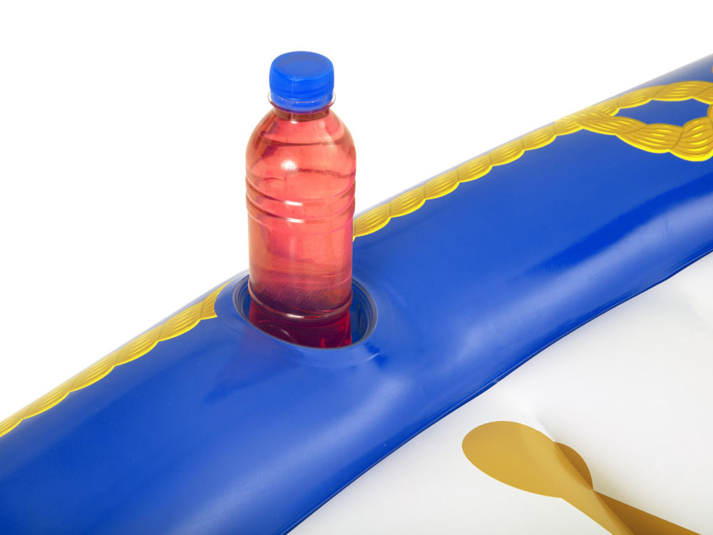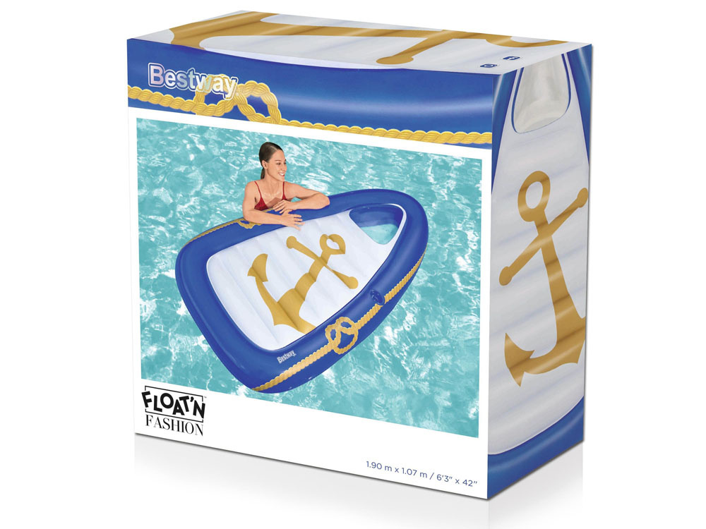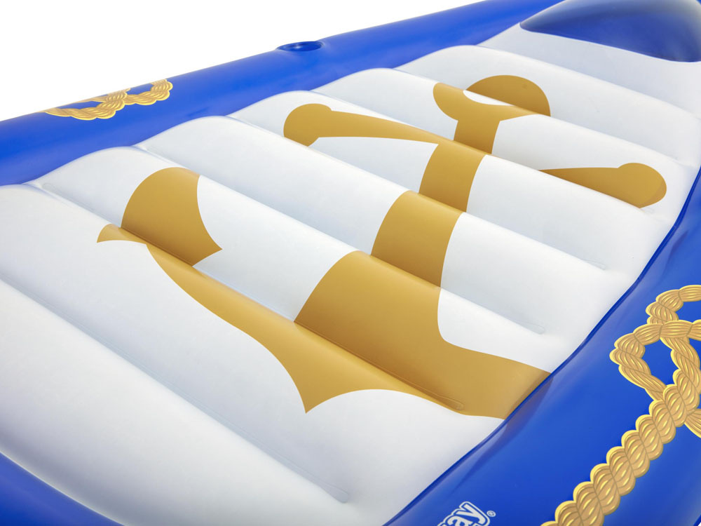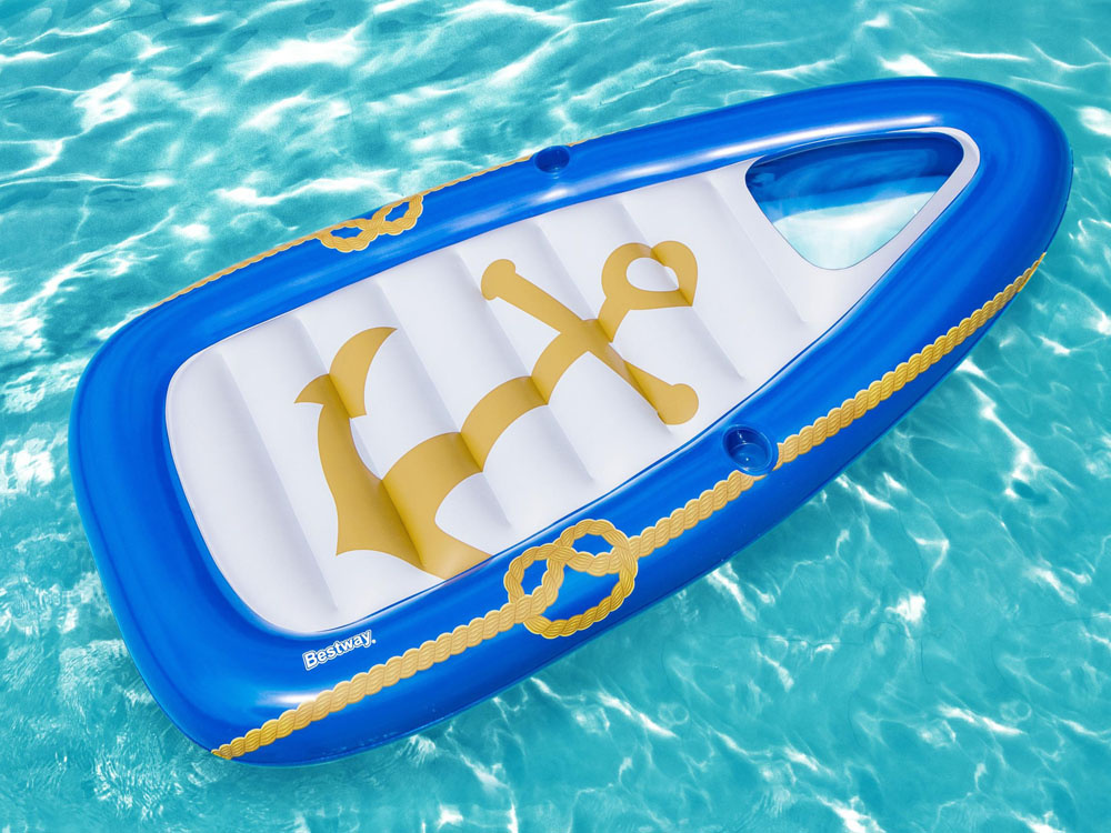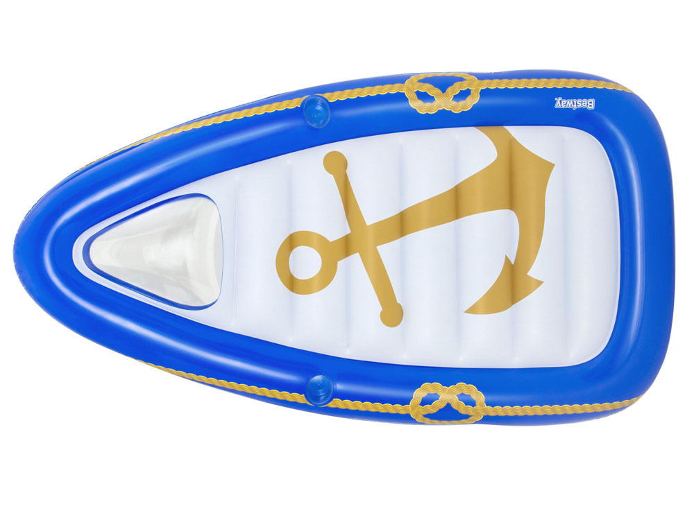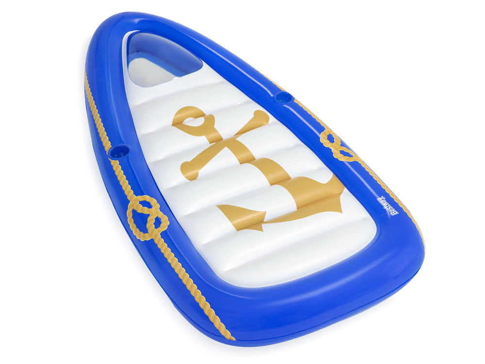 Dmuchany materac łódka Bestway® Nautical Paradise to propozycja na zbliżające się upalne lato. Materac w kształcie łódki wraz z elementem graficznym kotwicy będzie znakomicie prezentował się na każdej tafli wody, przyciągając wzrok każdego plażowicza. Rozmiar 190 x 107 cm bez problemu pomieści 1 osobę o maksymalnej wadze 90 kg. Materac jest lekki i można go zabrać ze sobą dosłownie wszędzie. Został wykonany z wytrzymałego winylu. Na pokładzie materaca znajdują się dwa uchwyty na kubki, aby móc ugasić pragnienie podczas odpoczynku, ale to nie wszystko materac posiada okienko dzięki któremu będziesz mógł oglądać podwodny świat.