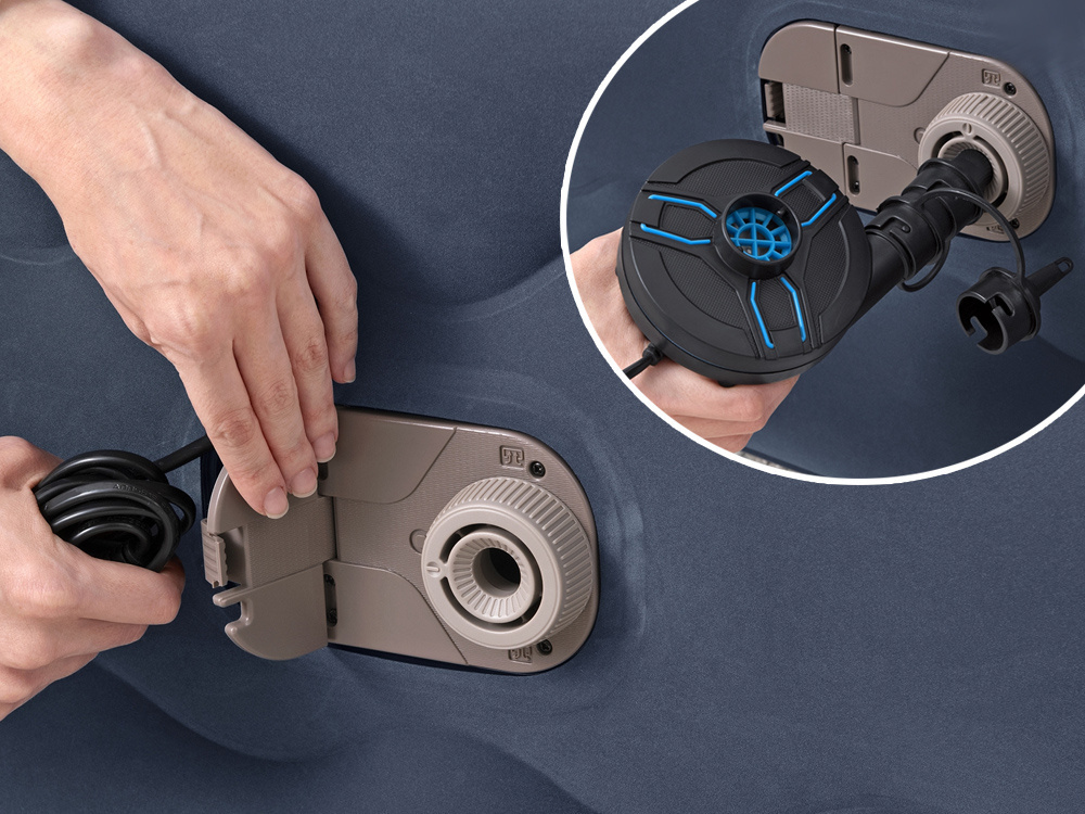 Materac Bestway Tritech Air Mattress King wyposażony jest w wbudowaną pompkę elektryczną 220-240V, która umożliwia szybkie i łatwe napompowanie oraz wypompowanie powietrza. Proces ten trwa zaledwie kilka minut, co znacznie ułatwia przygotowanie miejsca do spania. W przypadku braku dostępu do prądu, materac można również napompować za pomocą standardowej pompki ręcznej lub nożnej.