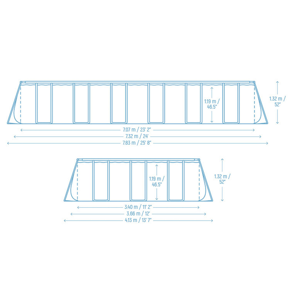 UWAGA! Rozmiar basenu z rurkami bocznymi stelaża: 783 cm x 413 cm