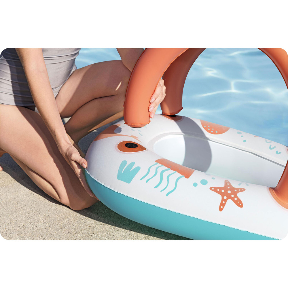 * Zawory bezpieczeństwa * Uprzednio przetestowany, wytrzymały materiał winylowy * Nadmuchiwana podłoga dla zapewnienia dodatkowego komfortu * Mocne uchwyty * Specjalny daszek do ochrony przed promieniami UV * Wykonany z miękkiego materiału, miłego w dotyku |