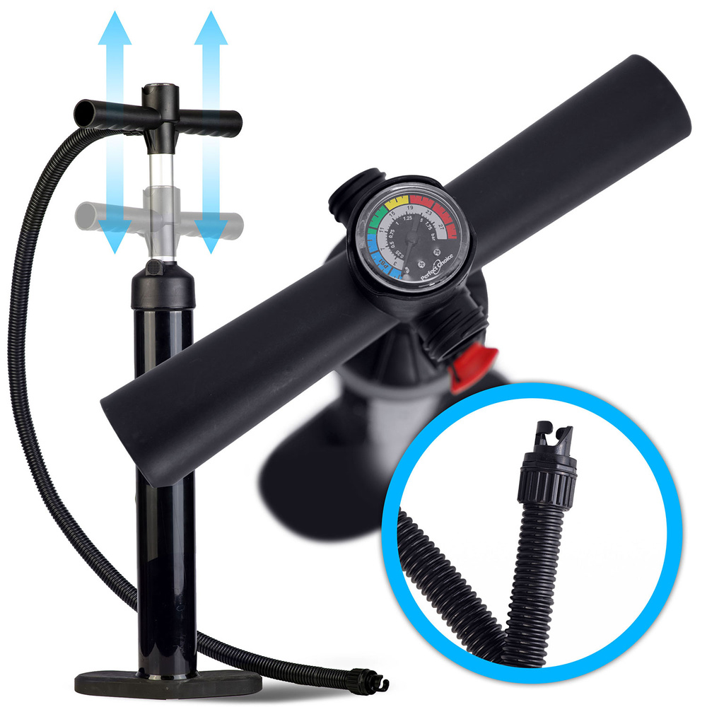 - Dwukierunkowe pompowanie – tłoczy powietrze zarówno przy nacisku, jak i unoszeniu tłoka – szybciej napompujesz deskę.