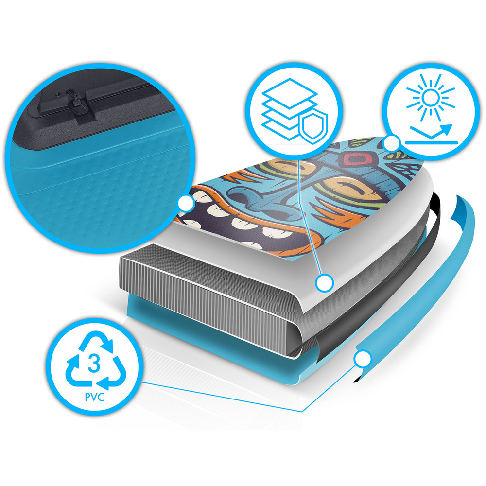 W zestawie: deska, pompka, wiosło, linka (leash), wyjmowany duży fin, plecak, zestaw naprawczy.