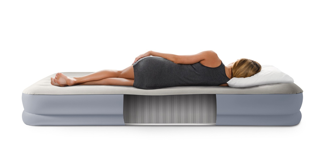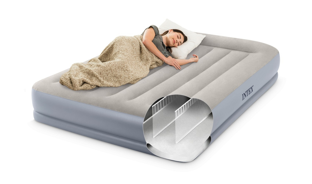 Wbudowana poduszka zapewni dodatkowy komfort podczas użytkowania. Górna część materaca została pokryta miłym w dotyku welurowym materiałem.Materac posiada wbudowaną pompkę (moc 220-240 V), dzięki której produkt będzie gotowy do użycia w bardzo krótkim czasie.Do zestawu dołączona jest łatka naprawcza.