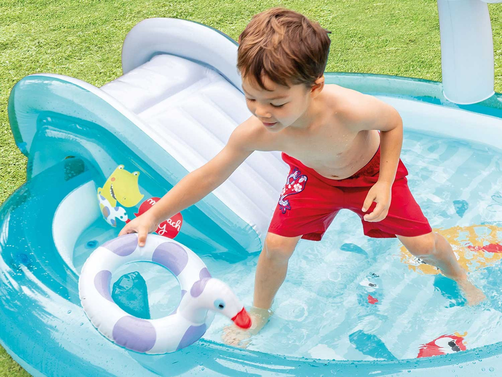 Główną atrakcją jest zjeżdżalnia dająca mnóstwo frajdy, spryskiwacz w formie fontanny tryskający z nozdrzy krokodyla (należy podłączyć wąż ogrodowy), dmuchane kółko dzięki któremu nasi milusińscy poczują się bezpieczniej, kolorowe rybki oraz dmuchane wiaderko do nieustannego przelewania wody, dmuchany daszek by odpocząć i skryć się przed promieniami słońca.